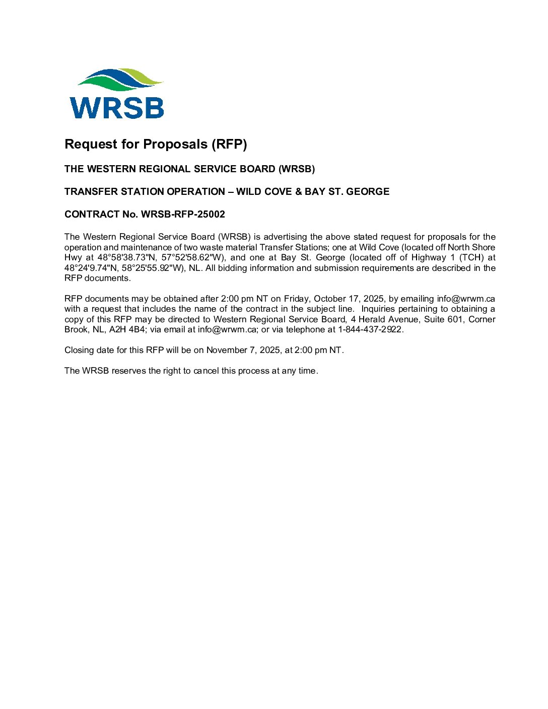 Request for Proposals (RFP)THE WESTERN REGIONAL SERVICE BOARD (WRSB)TRANSFER STATION OPERATION – WILD COVE & BAY ST. GEORGECONTRACT No. WRSB-RFP-25002The